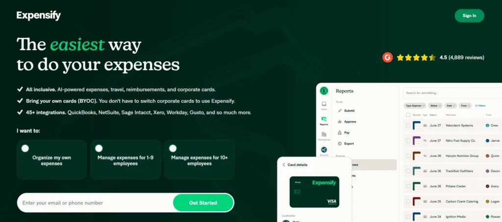 Expensify simplifies expense tracking, reimbursement, and reporting. Its AI-powered receipt scanning and automated categorization reduce manual review and ensure clean, accurate expense records.