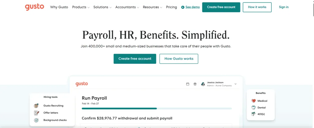 Gusto is a modern payroll and HR platform that automates payroll runs, tax filings, and employee onboarding. With compliance tools and benefits administration built in, it offers a complete payroll automation solution for businesses of all sizes.