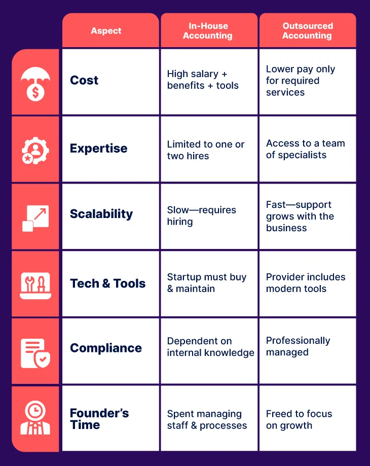 Outsourced accounting services offers a better path. Instead of hiring a full in-house team, startups can rely on an outsourced accounting firm for startups to manage financial operations with accuracy, speed, and flexibility. For this reason, outsourcing has become a strategic choice for founders who want less admin and better financial control from day one.