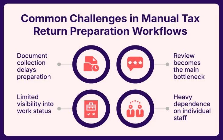 Every return should follow the same defined stages, which include data collection, preparation, review, and filing. Standardization reduces confusion, improves handoffs, and ensures consistent quality across teams.