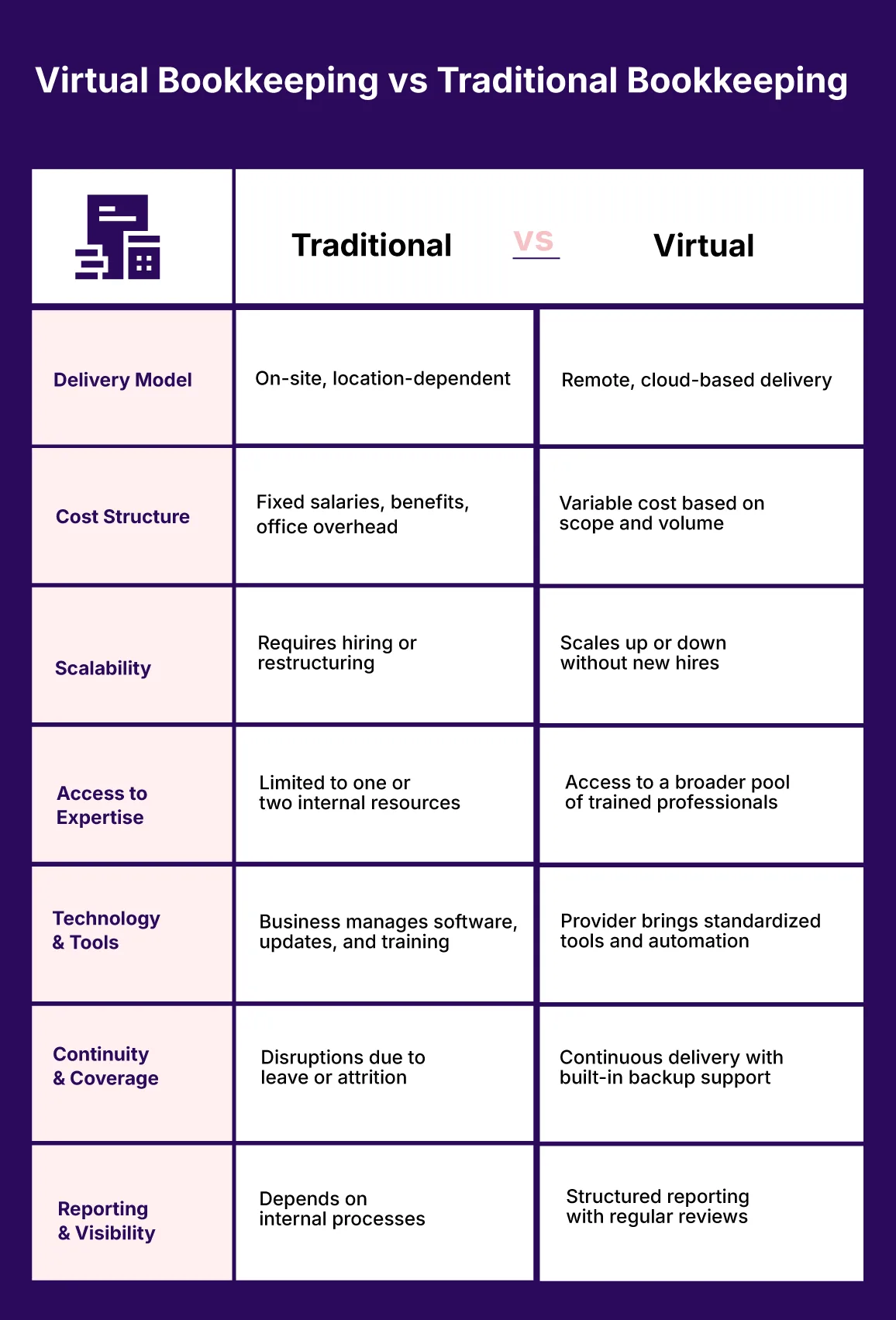 Both models deliver accurate books. However, virtual bookkeeping aligns better with businesses seeking efficiency and adaptability. Here’s a more detailed comparison of the two.