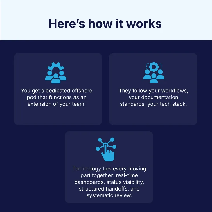 A true Outsourcing 3.0 partner doesn’t send random offshore staff. They build a dedicated delivery pod that operates within your tech stack, adheres to your SOPs, and integrates seamlessly into your workflow without adding management burden.