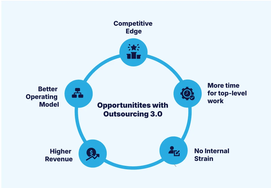 Enter Outsourcing 3.0! Tech-enabled outsourcing that blends Talent + Technology + Transformation. Older outsourcing models were reactive. When work spiked, firms “sent work out.” It was more like a relief valve, less like a strategy.